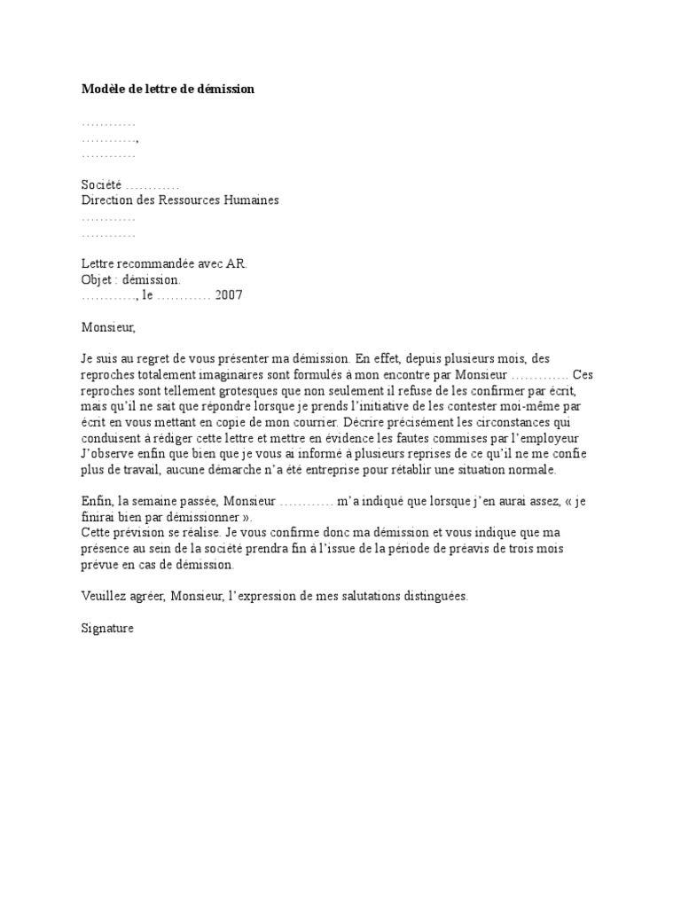 Je soussigné nom prenom, vous informe de ma décision de vous présenter ma démission du poste de votre poste, à compter de la date de ce courrier. Résiliation de bail avec préavis de trois mois en principe et comme le prévoit la loi, le locataire d'un logement non meublé peut donner congé au propriétaire de son appartement avant terme (quand il le souhaite), y compris peu de temps après. Lettre de démission avec préavis réduit. Voici ce à quoi votre lettre de. La lettre de démission par recommandé n'est pas obligatoire, à part dans certaines dispositions conventionnelles, mais elle est très recommandée pour.